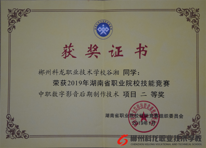 由湖南省教育廳主辦的2019年湖南省職業(yè)院校技能競(jìng)賽“中職數(shù)字影音后期制作技術(shù)”獲獎(jiǎng)名單于2018年12月26日揭曉。在此次比賽中,郴州科龍職業(yè)技術(shù)學(xué)校的谷湘同學(xué)喜獲二等獎(jiǎng)。